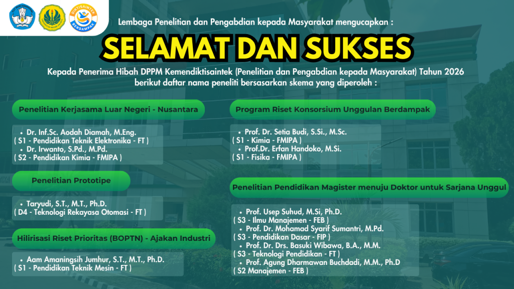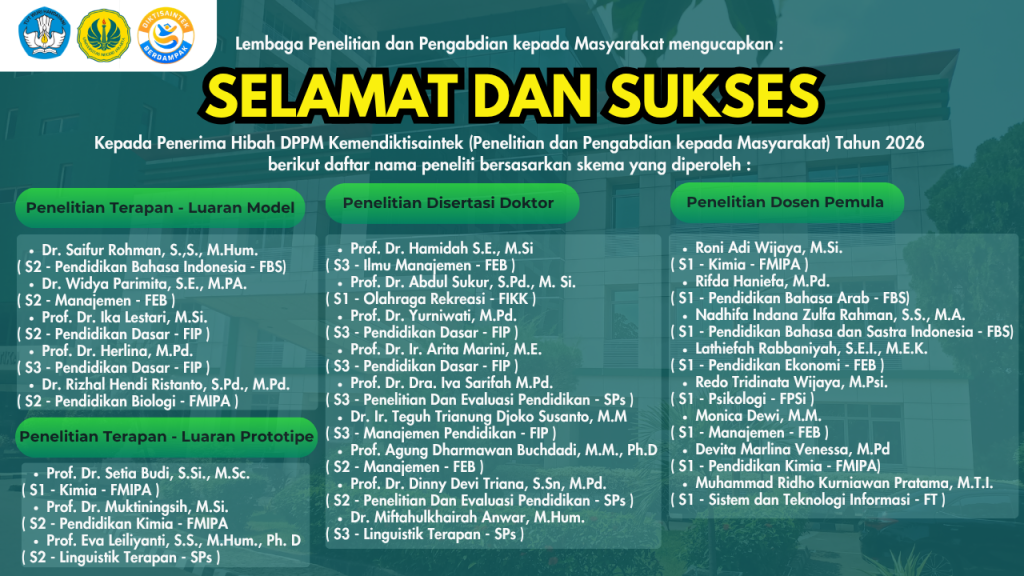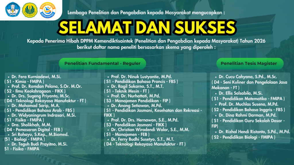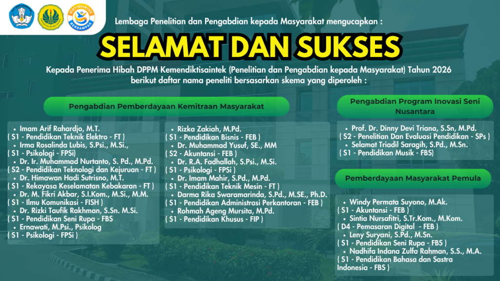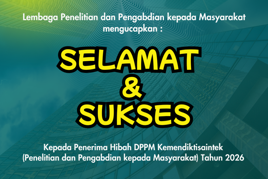 Lembaga Penelitian dan Pengabdian kepada Masyarakat (LPPM) menyampaikan ucapan selamat dan apresiasi yang setinggi-tingginya kepada para dosen peneliti yang telah berhasil meraih pendanaan Hibah DPPM Kemendiktisaintek Tahun 2026 dalam skema Penelitian dan Pengabdian kepada Masyarakat.